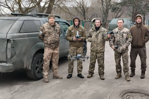 Хлопці з дронами, які роздобув Михайло Ткач. На задньому плані - машини, які ми роздобули раніше